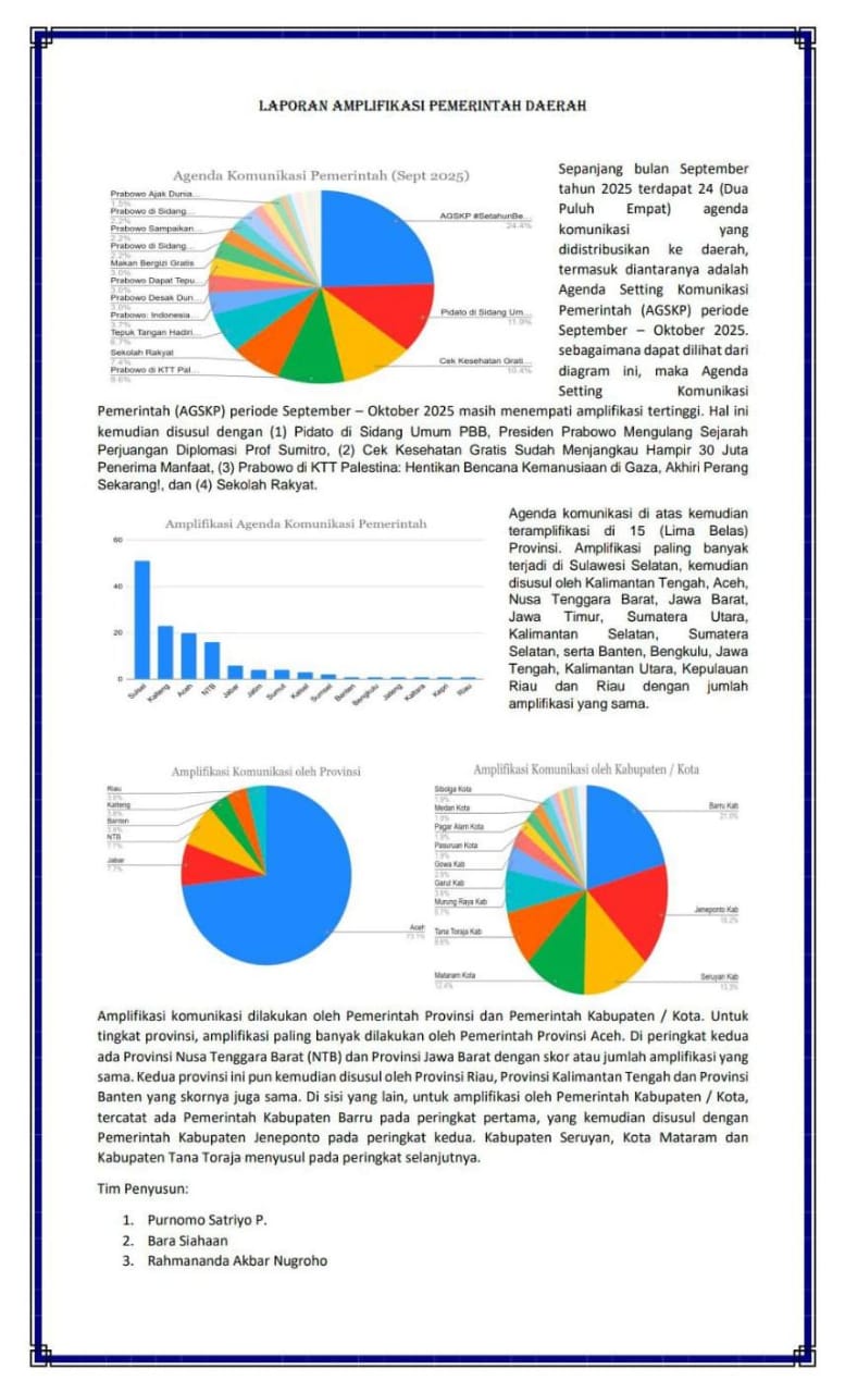 Laporan tersebut merupakan rekapitulasi aktivitas komunikasi dan publikasi yang dilakukan oleh pemerintah daerah di seluruh Indonesia, baik tingkat provinsi maupun kabupaten/kota. Tujuan dari laporan ini adalah untuk mengukur sejauh mana pemerintah daerah berperan aktif dalam menyebarluaskan informasi dan pesan-pesan strategis pemerintah pusat kepada masyarakat melalui berbagai kanal komunikasi, seperti situs web resmi, media sosial, serta media berita.