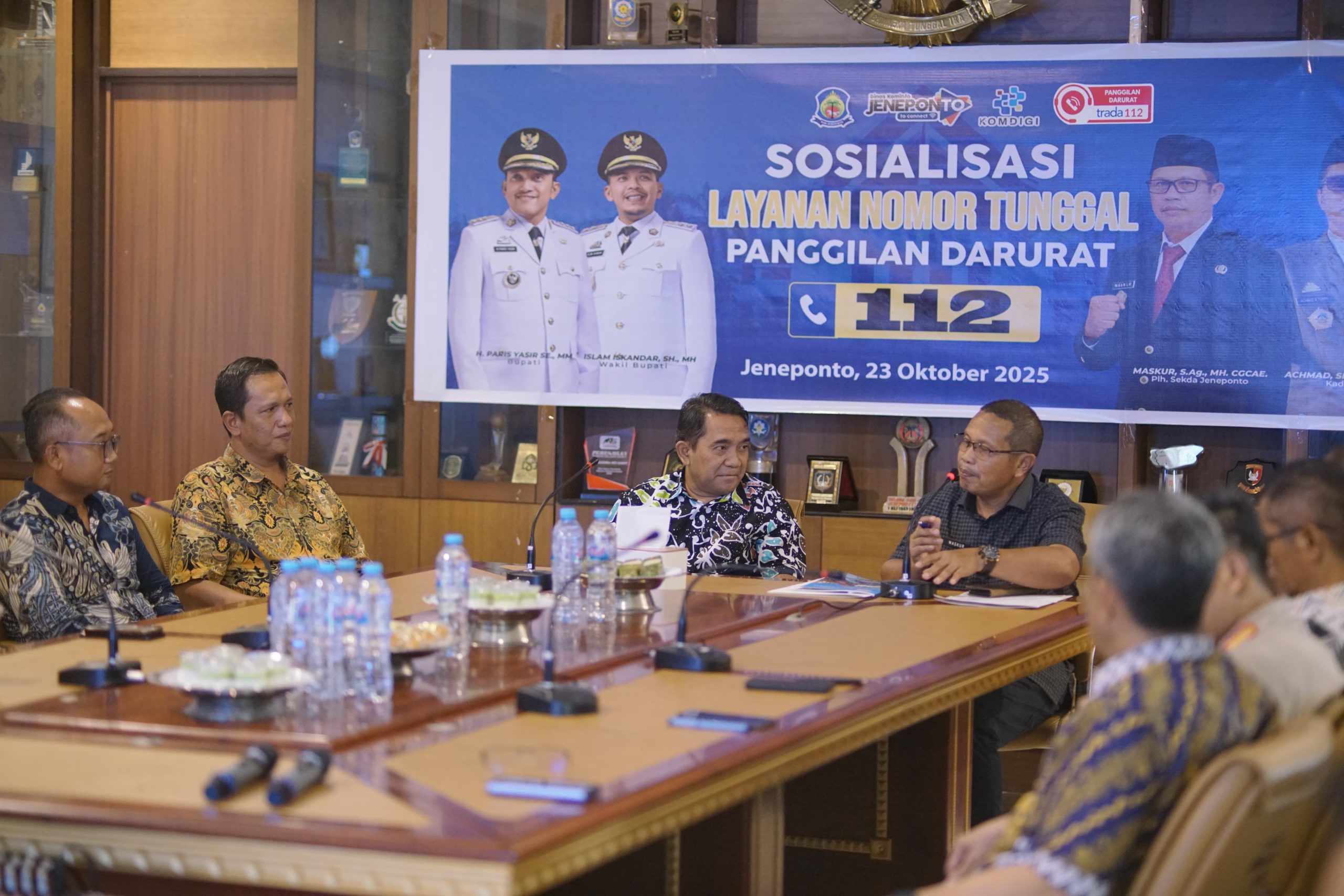 beritakabarbaru.com, Jeneponto, 23 Oktober 2025 — Kementerian Komunikasi dan Digital (Komdigi) Republik Indonesia melaksanakan kegiatan Sosialisasi Layanan Nomor Tunggal Panggilan Darurat (NTPD) 112 di Ruang Rapat Bupati Jeneponto. Kegiatan ini dihadiri oleh tim dari Kementerian Komdigi yang dipimpin oleh Agung Setio Utama selaku Ketua Tim, bersama anggota Rismanto, Irwan Abdul Rahman, dan Hari Rianto.